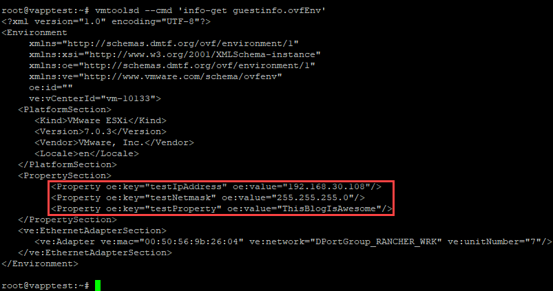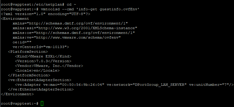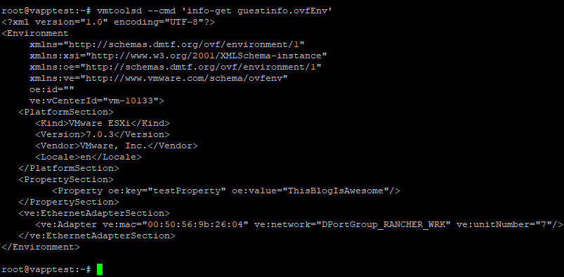vmtoolsd --cmd 'info-get guestinfo.ovfEnv'All that’s left now is to use them.