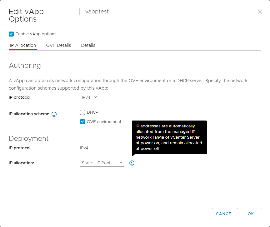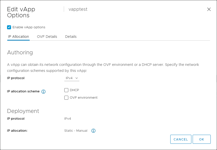 - vApp IP allocation policy – Specifies IP allocation strategy (we want Static – IP Pool which = “fixedAllocated”)