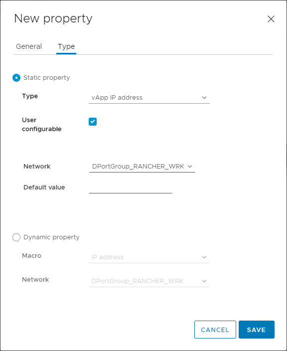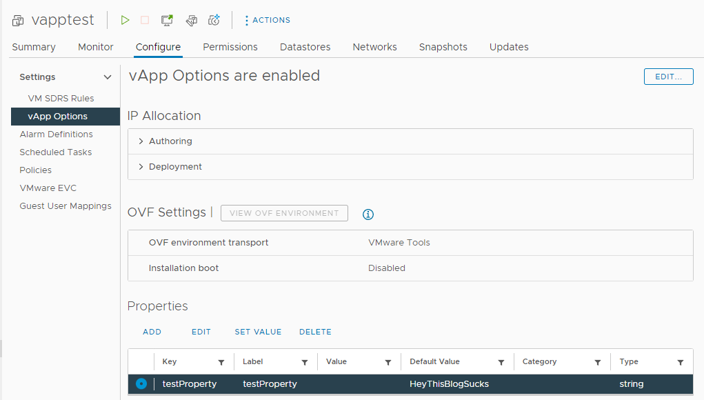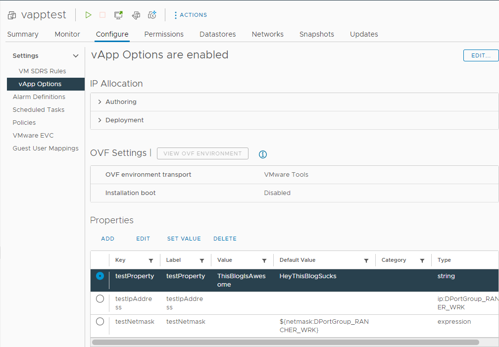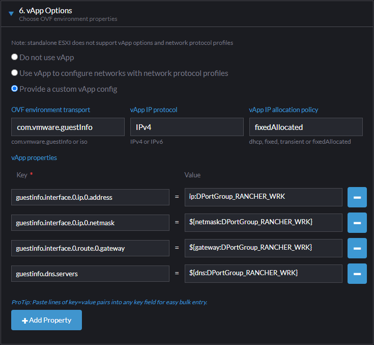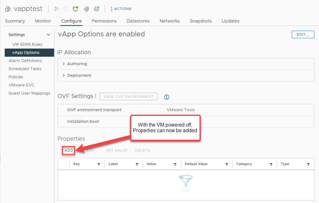 - vApp properties – The list of property names or expressions and the keys we want to use to pass them into the OVF Environment