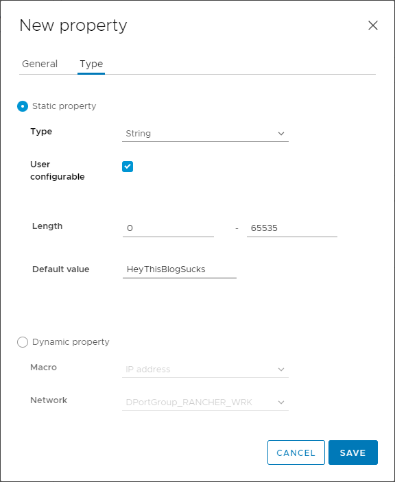 I’m going to skip discussing the details of creating a vSphere Node Template as that’s pretty straightforward. And before touching on the Cloud Config YAML, I’m going to skip down to the vApp Options section of my Node Template: